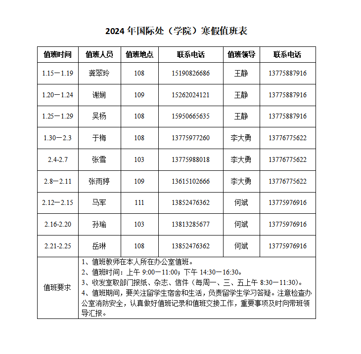 2024年国际处(学院)寒假值班表
